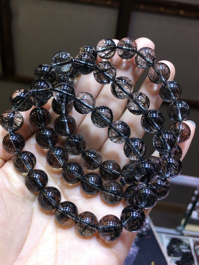 The black rutilated quartz bracelet originating from Brazil is a rare treasure among natural crystals. Each bead is crystal clear, with black hair – like minerals criss – crossing, resembling a vast and mysterious nebula, showing a unique and profound beauty.