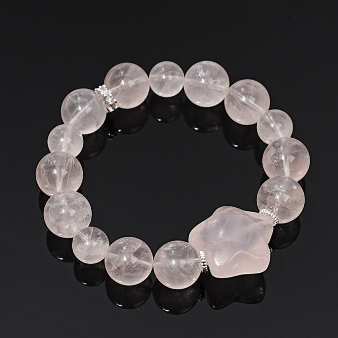 The unique irregularly shaped rose quartz main stone in the center of the bracelet is like a one-of-a-kind adventure in love. Its shape is unconventional, just as every love story has its own unique appearance, full of surprises and uncertainties. This special stone carries the exclusive memories between lovers. Perhaps it’s a romantic date or a heartfelt confession. Every moment related to it is like a shining starlight, engraved in each other’s hearts.