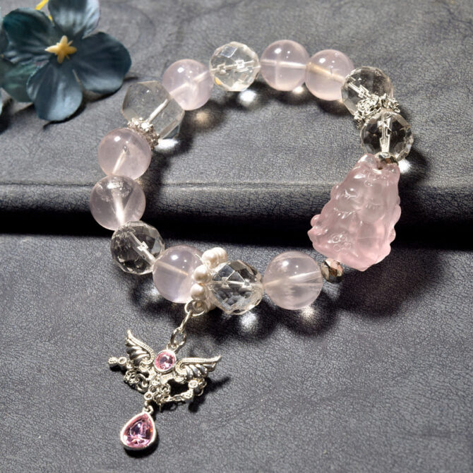 This bracelet is the embodiment of romance and beauty. The main stone, rose quartz, is like the cherry blossoms that first bloom in spring. It has always been regarded as a symbol of love. Legend has it that it can attract romantic opportunities and bring sincere and sweet love to the wearer. The transparent white crystal is intertwined with it, just like the pure and steadfast companionship in love.
